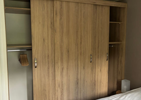 Er zijn twee slaapkamers; de hoofdslaapkamer heeft een tweepersoonsbed met aparte matrassen en een ruime kledingkast en de tweede slaapkamer bestaat uit twee eenpersoonsbedden en met eveneens voldoende kastruimte.